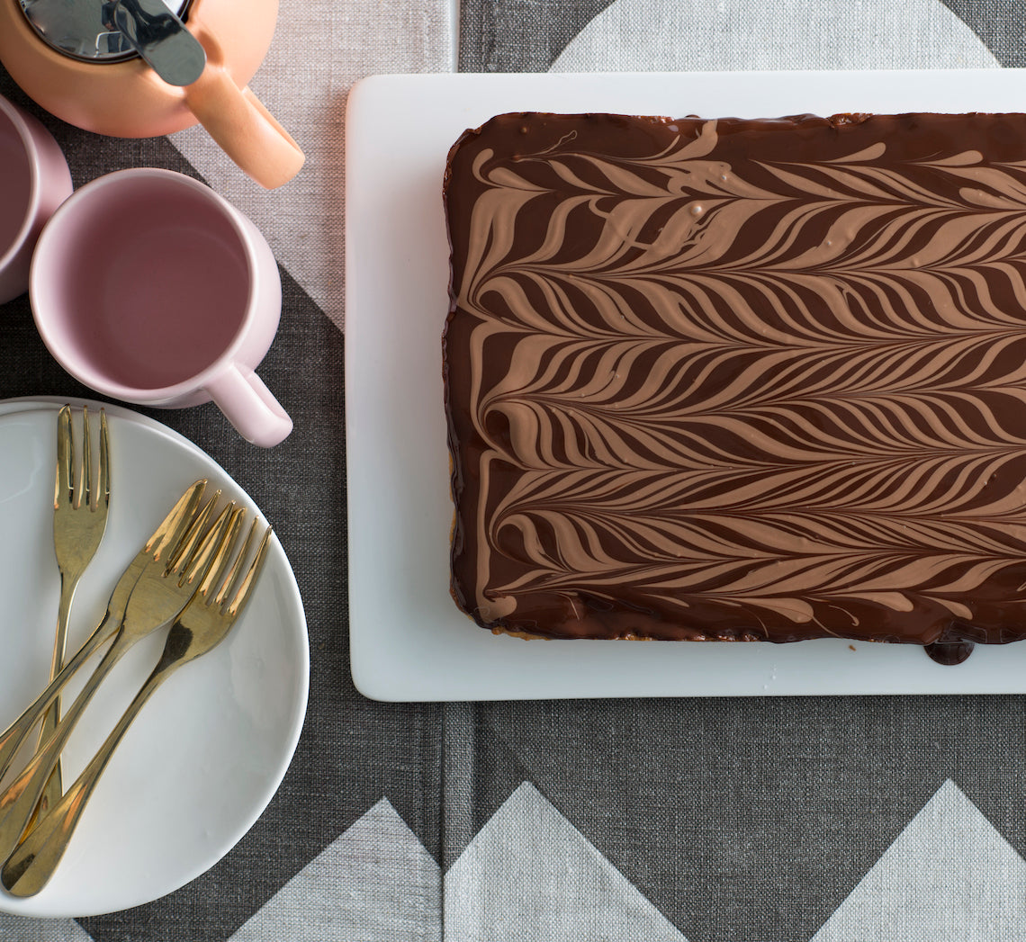- To make the Chocolate Topping, combine the dark chocolate and butter in a medium heatproof bowl over a saucepan of simmering water (don’t let the water touch the base of the bowl). Stir frequently until the chocolate melts and the mixture is smooth. Pour over the cooled slice and use the back of a metal spoon to cover evenly. Tap the tin on the bench to even the topping and to remove any air bubbles. Melt the milk chocolate in the same way as the dark chocolate and butter in a separate small heatproof bowl. Place the slice with a short side of the tin closest to you. Use a teaspoon to generously drizzle the milk chocolate widthways across the dark chocolate to form horizontal lines. Then use a skewer to run through both the dark and milk chocolate lengthways 5-6 times in alternate directions to form a feather pattern. Place in the fridge for 1 hour or until the chocolate sets.