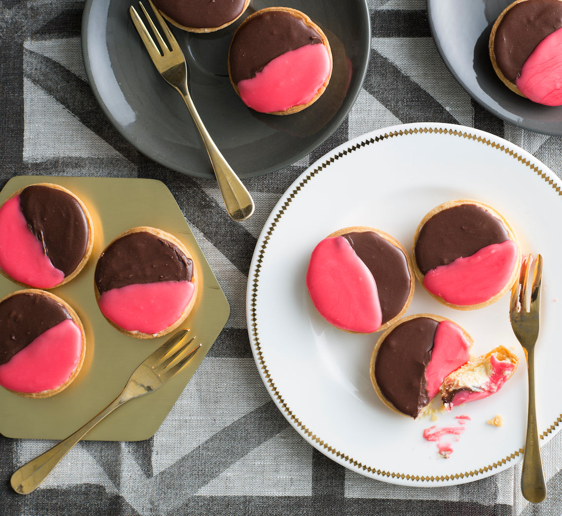 - To make the Icing, sift the icing sugar into a bowl and then stir in the water until smooth (the icing should be a spreadable consistency). Put half the icing into a separate bowl and stir in the cocoa powder and extra teaspoon of water. Colour the remaining portion with 2-4 drops of pink food colouring. Use a palette knife or the back of a teaspoon to spread about a teaspoon of the pink icing over the top of half of each tart. Set aside for 5-10 minutes for the icing to set. Spread about a teaspoon of the chocolate icing over the remaining half of each tart to cover the tops and then set aside for 5-10 minutes for the icing to set. Serve at room temperature.
