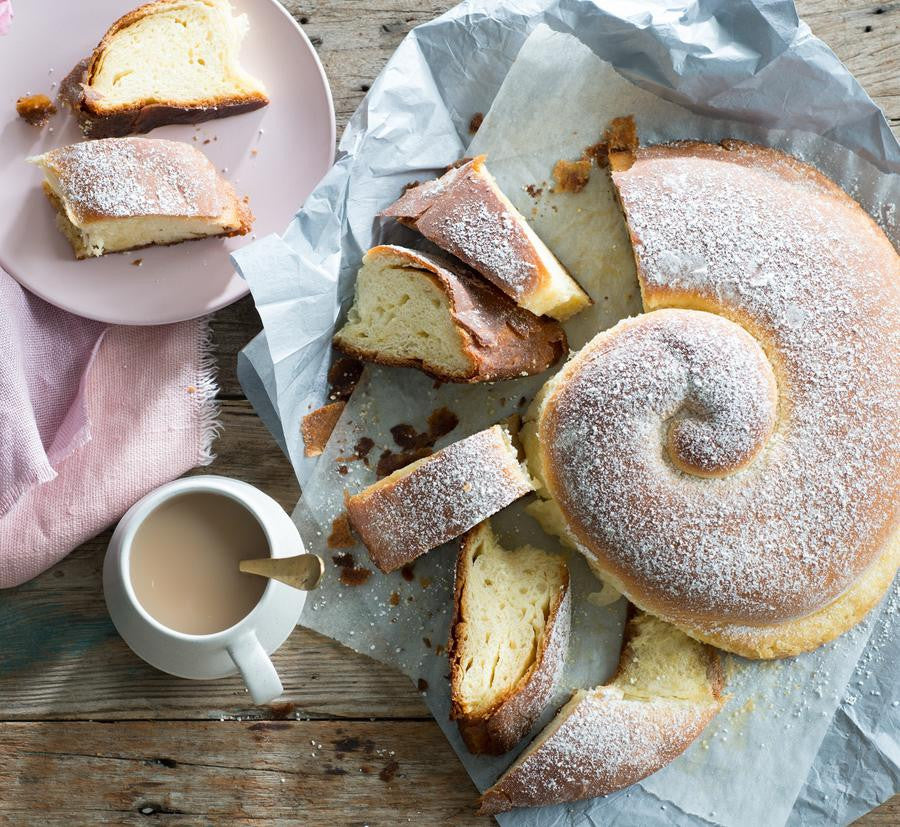 - Bake the Ensaïmada in preheated oven for 30 minutes or until cooked through and golden. Place the baking tray on a wire rack and set aside on the tray for at least 10 minutes to cool slightly before serving warm or cool completely. Serve dusted liberally with icing sugar.