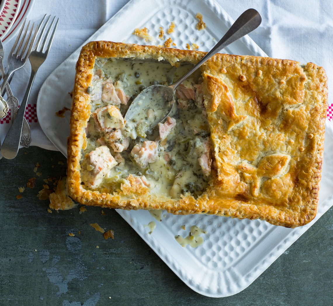 - Use a lightly floured rolling pin to roll out the pastry on a lightly floured surface to the shape of the dish until about 4mm/⅛in thick. Spoon the cooled salmon mixture into the dish, then brush the edge of the dish with a little of the egg wash. Place the pastry over the filling to cover, then use a small sharp knife to run around the edge of the pie dish on a slight angle to trim the excess pastry. Use a fork to press around the edge of the dish to seal. Cut a cross in the top of the pie and then brush the pastry with a little egg wash to glaze. Decorate the top with the off-cuts of pastry, if desired, and then glaze again with the little of the egg wash.