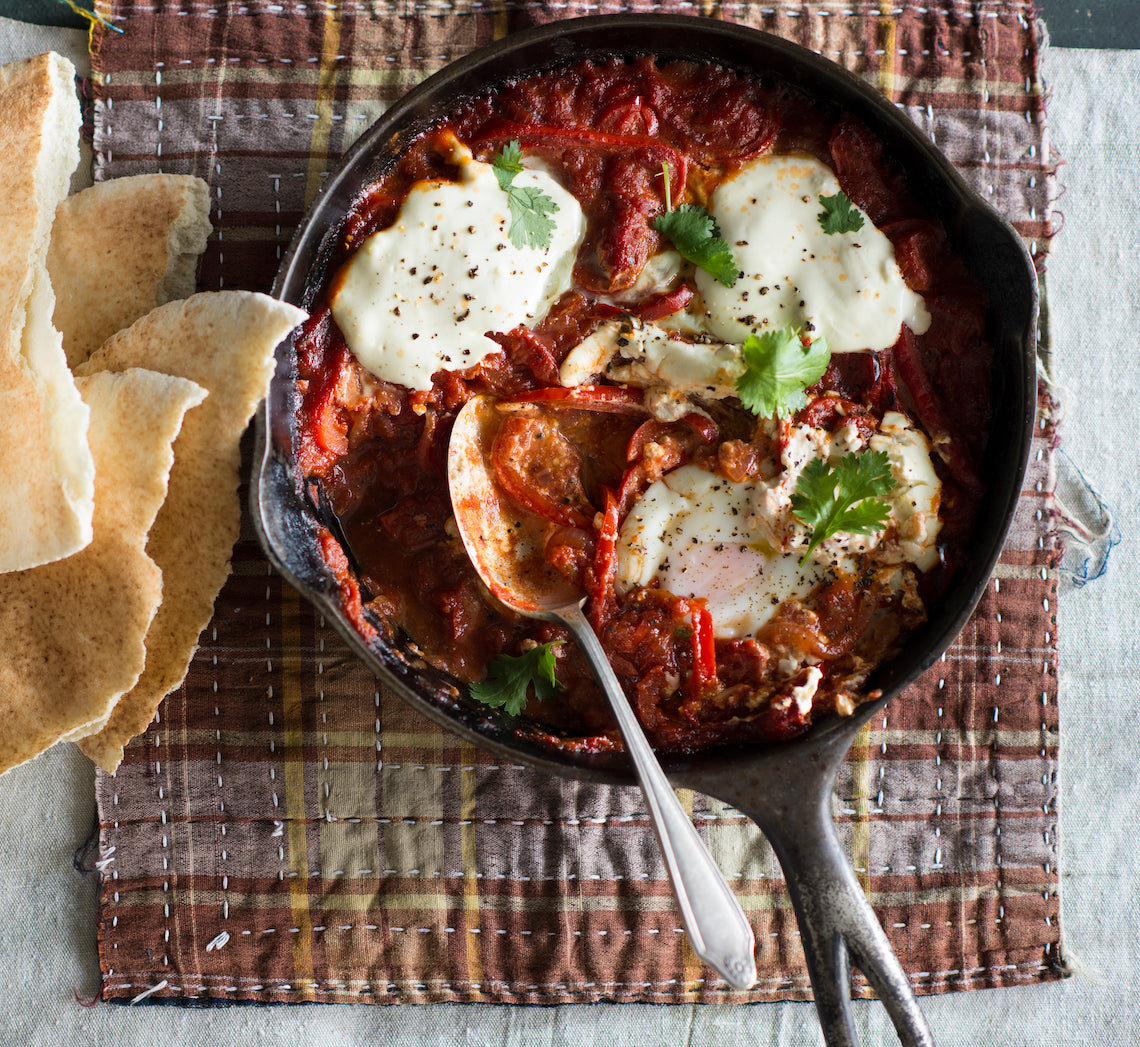 Nestled in an aromatic, slightly spicy tomato and capsicum sauce and topped with tangy yoghurt, these baked eggs, originally from Tunisia, make for a wonderful centre-of-the-table brunch dish. Serve with pita bread and let everyone help themselves.