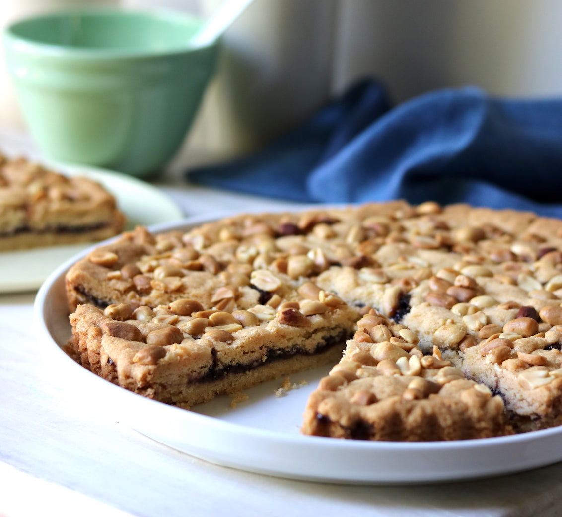 - Press half of the mixture evenly over the base of an ungreased 23cm/9in tart tin with removable base. Spread evenly with the jam, leaving a 2cm/¾in border. Press portions of the remaining dough between your hands to flatten and press over the jam to cover, patching where necessary. Sprinkle with the peanuts and press into the dough.
