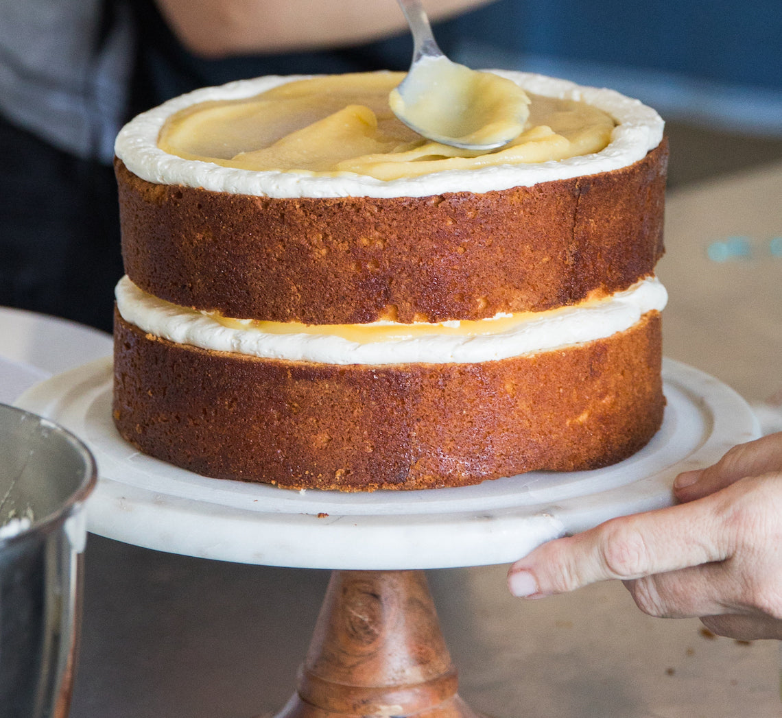 - To assemble the cake, use a large sharp serrated knife to level the tops of the Lemon Drizzle Pound Cakes if necessary. Place one of the cakes on a serving plate or cake stand. Spoon about a quarter of the Swiss Meringue Buttercream into a piping bag fitted with a #11 (1.1cm) round piping nozzle and pipe a border of buttercream around the top outside edge of the cake. Spoon about ⅓ cup of the chilled lemon curd into the centre of the cake and spread evenly to the buttercream. Spoon about ⅓ cup of the remaining buttercream in small dollops over the lemon curd and use a small palette knife or the back of a metal spoon to spread gently to cover the curd. Continue to layer the cake, curd and buttercream finishing with a cake layer.