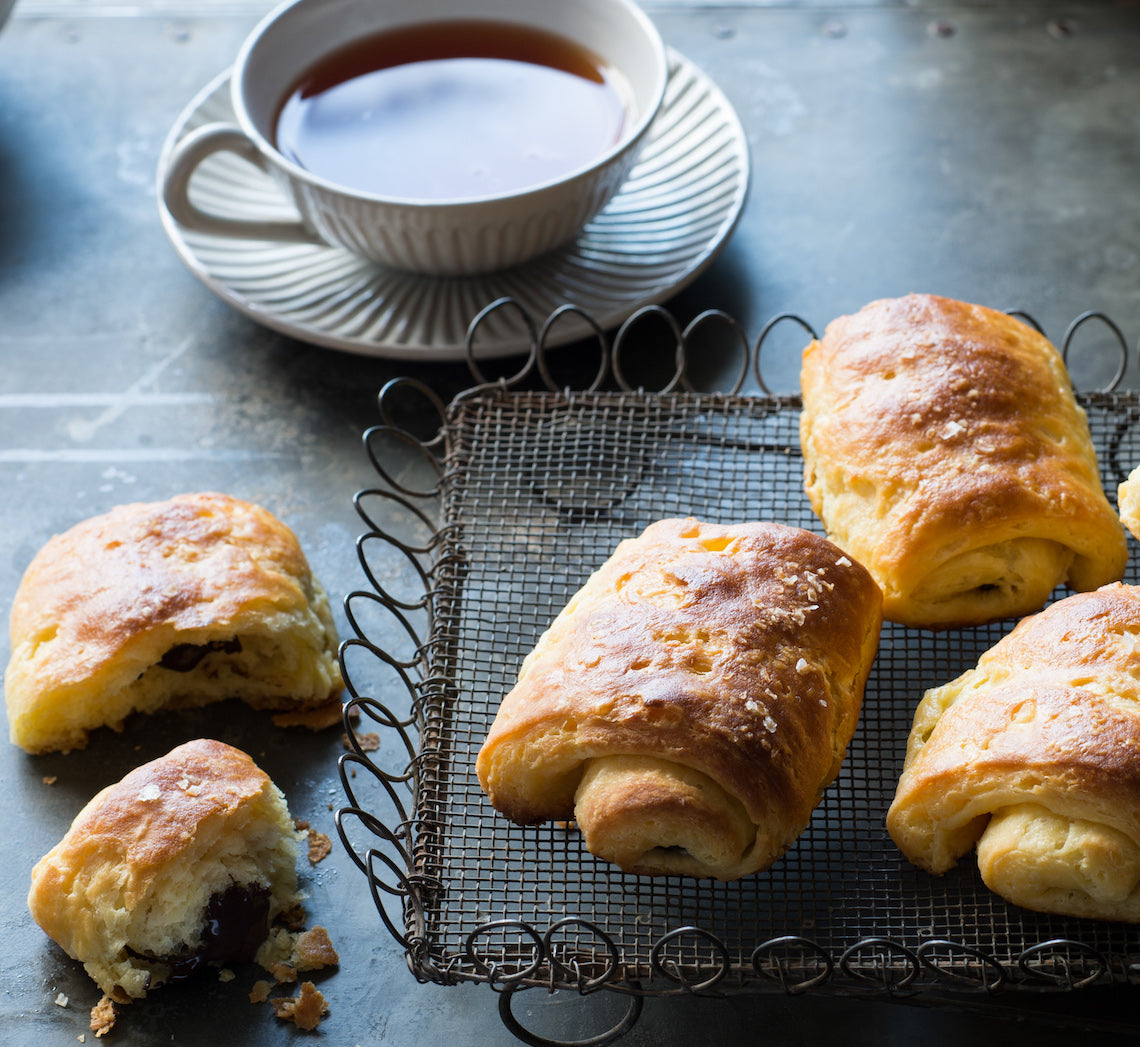 At their best warm from the oven, these classic French pastries are based on the same pastry as a croissant, known as a leavened puff pastry (basically a puff pastry with yeast). These pain au chocolat uses a cheat’s pastry of sorts and gives a similar, less refined, result as the traditionally-made pastry, without the hassle of having to interleave the butter with the pastry dough as you fold it. The light sprinkling of sea salt flakes adds a surprising yet pleasant contrast to the sweetness of the chocolate centre.