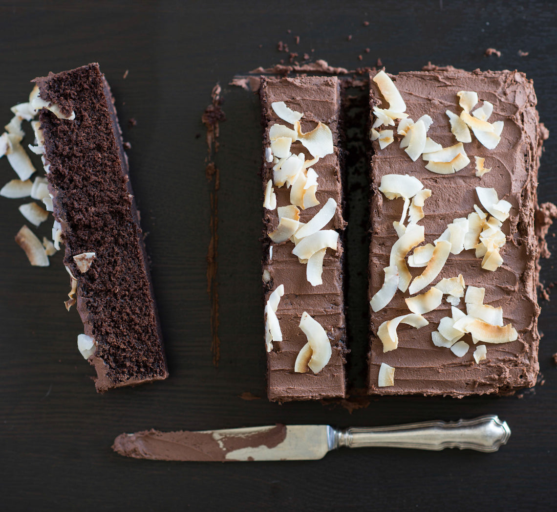 - Use a hot, dry knife trim the edges of the cake and then cut into 18 pieces (each about 7cm x 3cm). Transfer to a serving plate. Soften the reserved Chocolate Ganache by heating in 10 second bursts on high and stirring between each burst until smooth. Cool until almost a piping consistency. Spoon into a piping bag fitted with a small star nozzle. Pipe a rosette of ganache at the end of each cake portion and rest a Monogramed Chocolate Disc against the rosette to hold it. Decorate with gold leave and dust as desired.