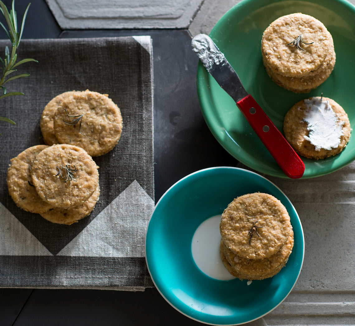 - Turn the dough onto a lightly floured surface and knead briefly until smooth. Divide the dough in half and use a lightly floured rolling pin to roll out one portion until 5mm thick. Use a 6cm round cutter to cut out discs and place on the lined trays about 2cm apart. Repeat with the remaining dough portion and any offcuts. Sprinkle the crackers with the extra rosemary leaves to garnish, and press lightly so they stick.