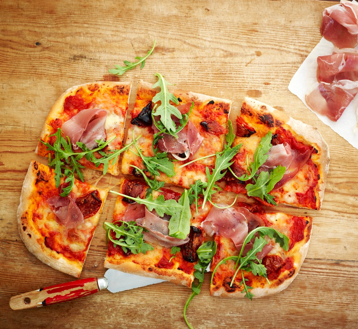 - Remove from the oven, cut into portions and serve topped with the fresh tomatoes (if using), prosciutto and rocket, sprinkled with freshly ground black pepper and drizzled with a little olive oil.