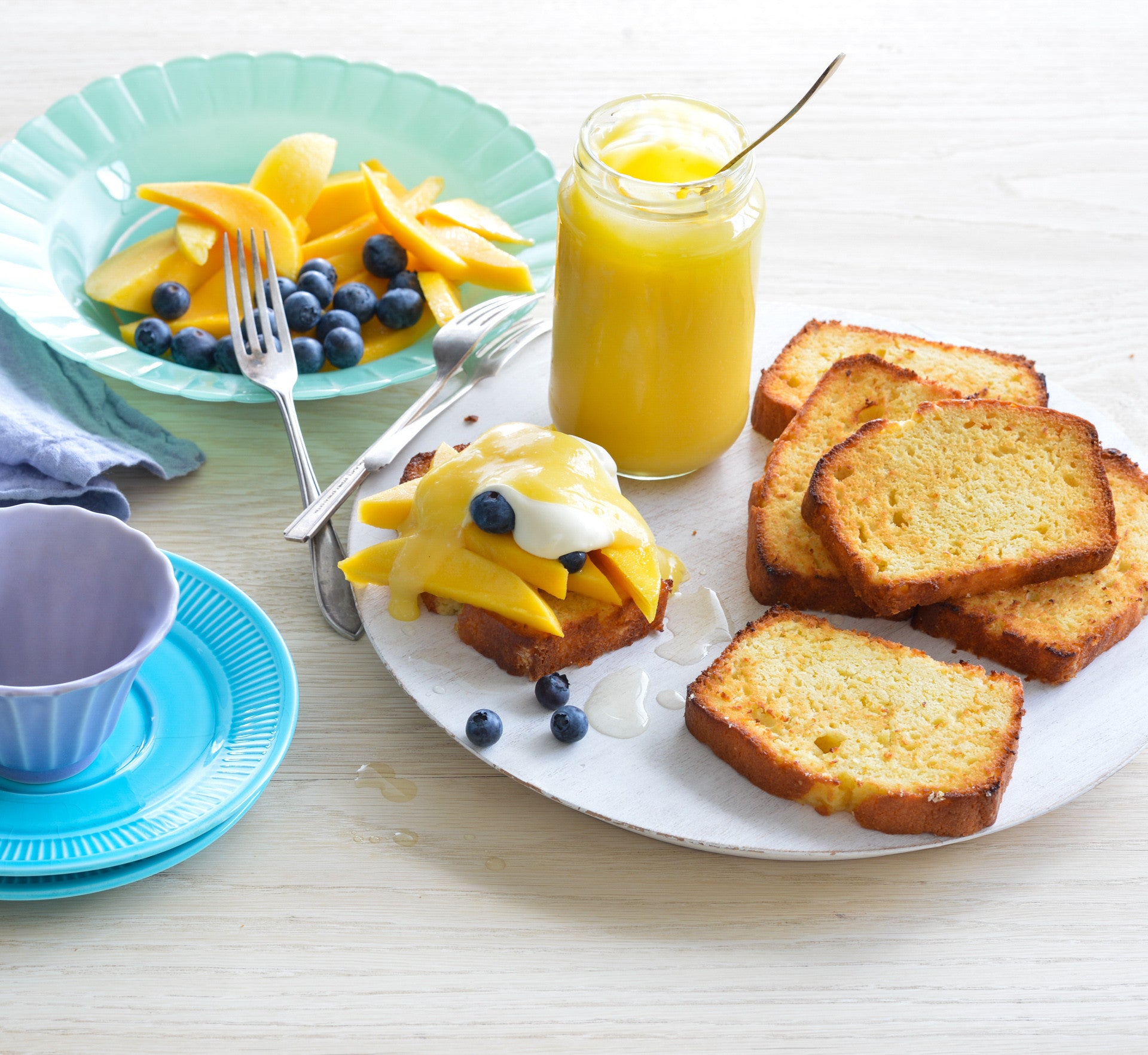 - To serve, combine the cream and sour cream in a medium bowl and use a balloon whisk to whisk until soft peaks form. Transfer to a serving bowl. Preheat a chargrill pan on high (see Baker’s tips). Cut the cake into 1.5 cm-thick slices and toast in a toaster until lightly golden and warmed through. Transfer to a plate and place in the centre of the table with the curd, syrup, fruit and cream for guests to assemble their own dessert.