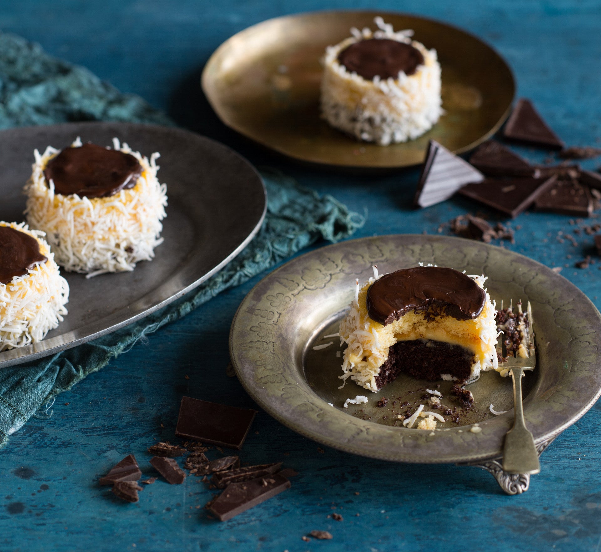 - To assemble, use a 6 cm round cutter to cut each of the Sponge cakes into 6 rounds. Place the round cutter over a chocolate sponge. Top the chocolate sponge round with about 1 tbsp of the Custard cream and then cover with around of plain sponge. Remove the pastry cutter. Repeat with the remaining chocolate and plain sponge rounds and 1 tbsp of Custard cream for each cake to make 6 layered cakes in total. Spread the sides of the cakes with the remaining Custard cream. Roll the sides of the cakes in the coconut to coat and place on a serving plate. Place in the fridge while making the Chocolate glaze.