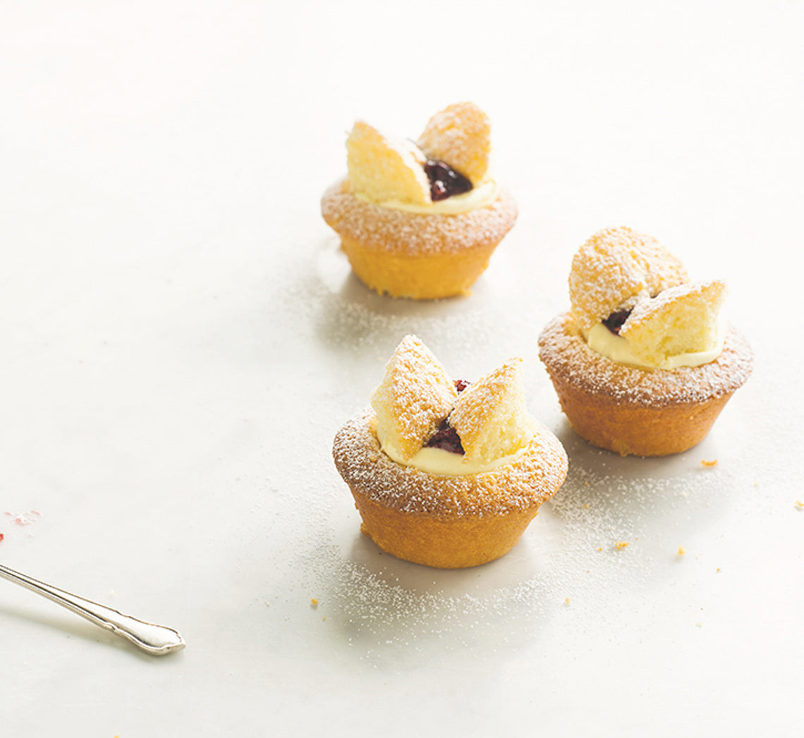 - Place the flour, sugar, butter, milk, eggs and vanilla in a large mixing bowl. Use an electric mixer to beat on low speed until combined. Increase the speed to medium and beat for 3 minutes or until the mixture is well combined and very pale in colour. Divide half the mixture among the friand pans and spoon the surface of each with the back of a teaspoon. Spoon ½ teaspoon of jam into the centre of each and then spoon the remaining cake batter over the top to cover, dividing evenly, and smoothing the surfaces carefully with the back of the spoon.
